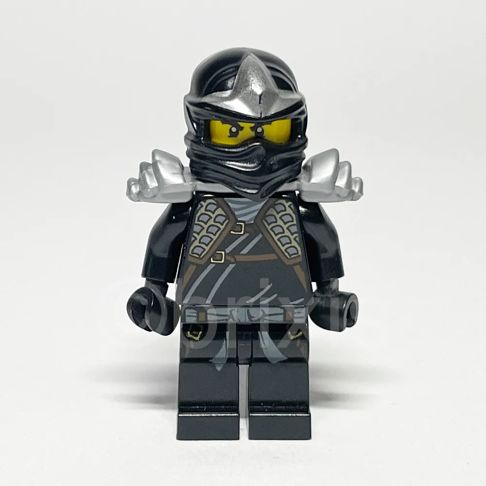 - Kopfbedeckung: Schwarze Kopfbedeckung im Ninjago-Wickelstil Typ 1 mit silbernem Drei-Punkte-Emblem, die den Kopf der Figur stilvoll umhüllt und schützt