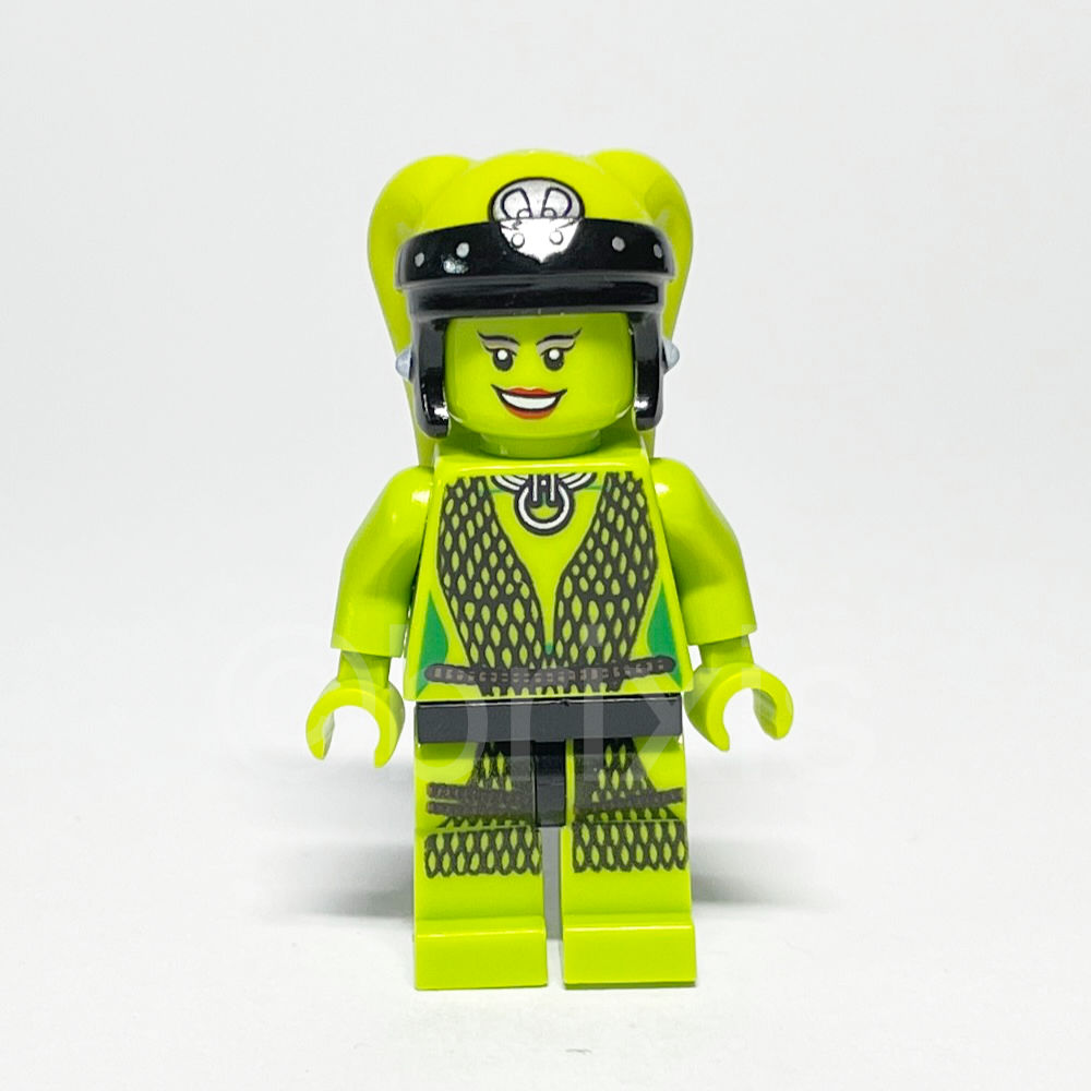 • Kopf: Limefarbener Kopf mit beidseitigem Alien-Gesicht, das schwarze geschwungene Augenbrauen, Wimpern, rote Lippen und einen lächelnden oder erschrockenen Ausdruck zeigt, passend für eine weibliche Minifigur